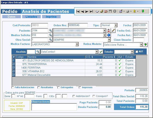 GAFLabo v 1.0 es un sistema permite llevar el control de pacientes con sus determinaciones bioquímicas, carga de pedido de análisis, facturación de los mismos, carga de resultados, emisión de informes y rendición a obras sociales.