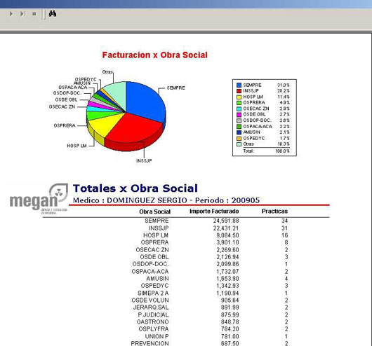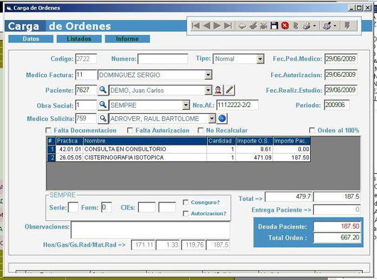 Este sistema permite realizar la carga de practicas y ordenes medicas y realizar la facturación de servicios y practicas medicas a Prepagos, Obras Sociales, A.R.T. y particulares. Es un sistema totalmente flexible y configurable que se adapta a cualquier tipo de calculo o forma de facturación.